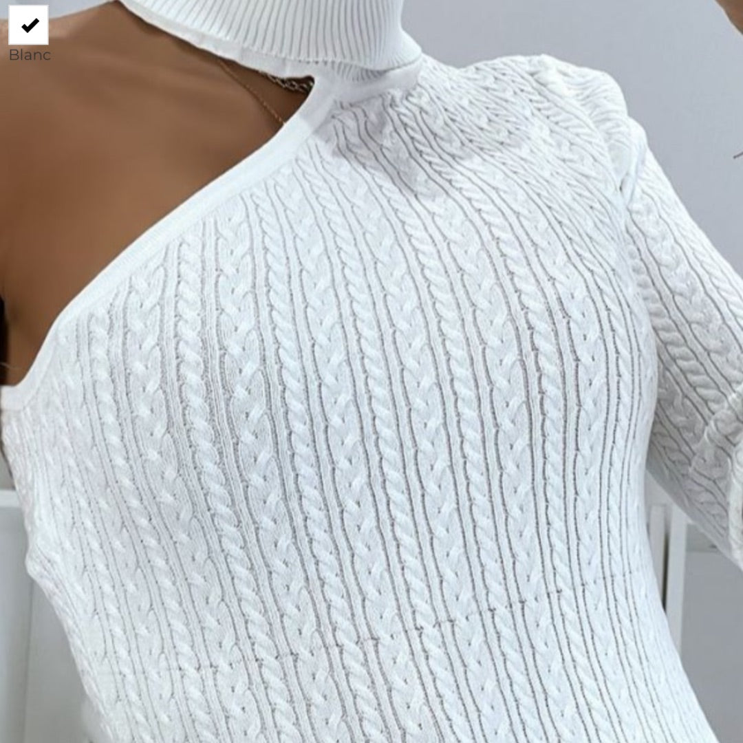 Pull blanc à maille torsadée col roulé et manche unique Taille unique du 36 au 42 68% Viscose 32% Polyester
